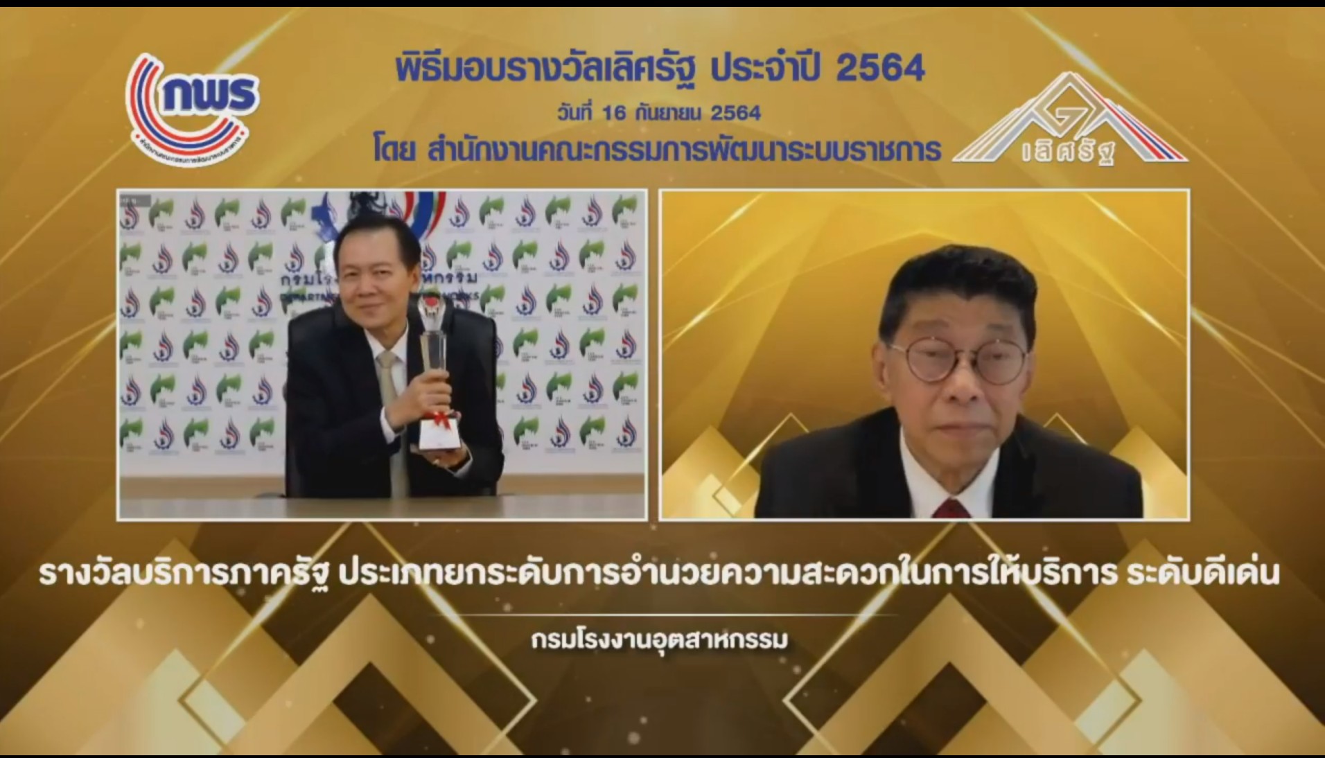 กรุงเทพฯ 17 ก.ย.-กรมโรงงานอุตสาหกรรม (กรอ.) คว้ารางวัลเลิศรัฐ ประเภทยกระดับการอำนวยความสะดวกในการให้บริการ ระดับดีเด่น ประจำปี พ.ศ. 2564 จากการเพิ่มขีดความสามารถตามนโยบายปฏิรูปอุตสาหกรรมสู่ 4.0 พร้อมเดินหน้านำเทคโนโลยีสารสนเทศเข้ามาเป็นเครื่องมือสำคัญเพื่อสนับสนุนการบริการและอำนวยความสะดวกแก่ผู้ประกอบการให้เกิดประโยชน์สูงสุด