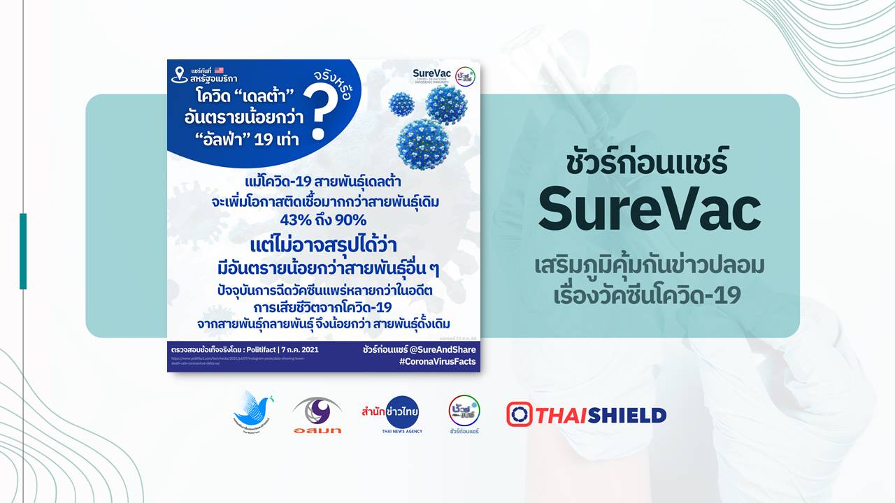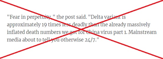 มีข้อมูลบิดเบือนเผยแพร่ผ่านทาง Instagram ในสหรัฐอเมริกา โดยอ้างว่าโควิด 19 สายพันธุ์เดลต้า หรือสายพันธุ์ที่มีต้นกำเนิดในประเทศอินเดีย มีความอันตรายน้อยกว่าสายพันธุ์อัลฟ่าถึง 19 เท่า โดยอ้างข้อมูลจากหน่วยงานสาธารณสุขของประเทศอังกฤษ