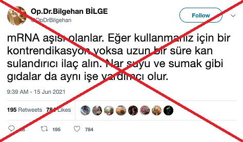 มีข้อมูลเท็จเผยแพร่ทางสื่อสังคมออนไลน์ในประเทศตุรกี โดยอ้างว่าผู้ที่ฉีดวัคซีนโควิด 19 ชนิด mRNA หรือวัคซีนชนิดเชื้อตายที่ใช้ในประเทศตุรกี จำเป็นต้องกินยาละลายลิ่มเลือดเพื่อป้องกันอาการลิ่มเลือดอุดตัน ซึ่งเป็นผลข้างเคียงจากวัคซีนโควิด 19
