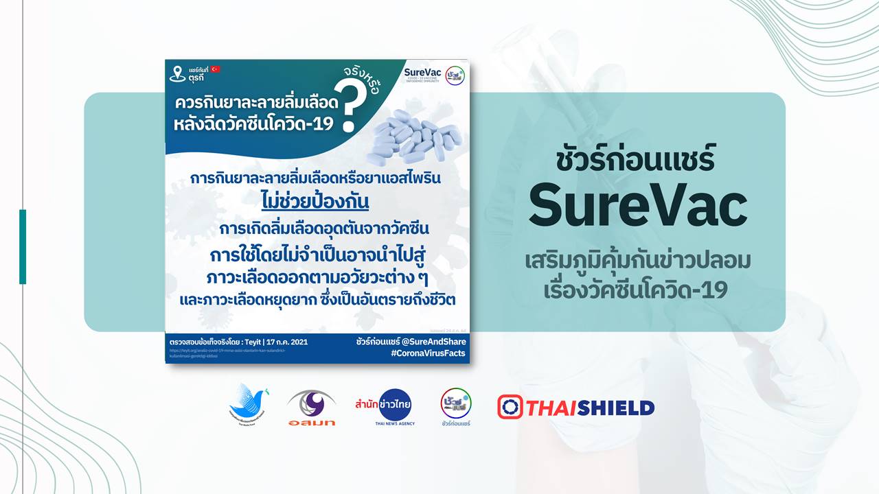 - การกินยาละลายลิ่มเลือดหรือยาแอสไพรินไม่ช่วยป้องกันการเกิดลิ่มเลือดอุดตันจากวัคซีน
