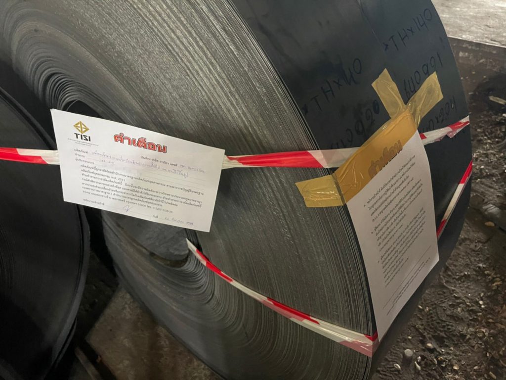 ส่วนอาคารหลังที่ 2 ภายในมีเหล็กโครงสร้างรูปพรรณขึ้นรูปเย็นสำหรับงานโครงสร้างทั่วไป และท่อเหล็กกล้าคาร์บอนเพื่อรอการจำหน่าย สมอ. จึงได้ดำเนินการอายัดเหล็กโครงสร้างฯ ทั้งหมด จำนวน 9,784 เส้น น้ำหนักรวม 205 ตัน มูลค่า 4.76 ล้านบาท พร้อมกับแจ้งระงับการใช้เหล็กกล้าทรงแบนรีดร้อนแผ่นม้วนที่ใช้เป็นวัตถุดิบในการผลิต จำนวน 149 ม้วน น้ำหนักรวม 278 ตัน มูลค่า 3.84 ล้านบาท ไว้เพื่อดำเนินคดีตามกฎหมาย