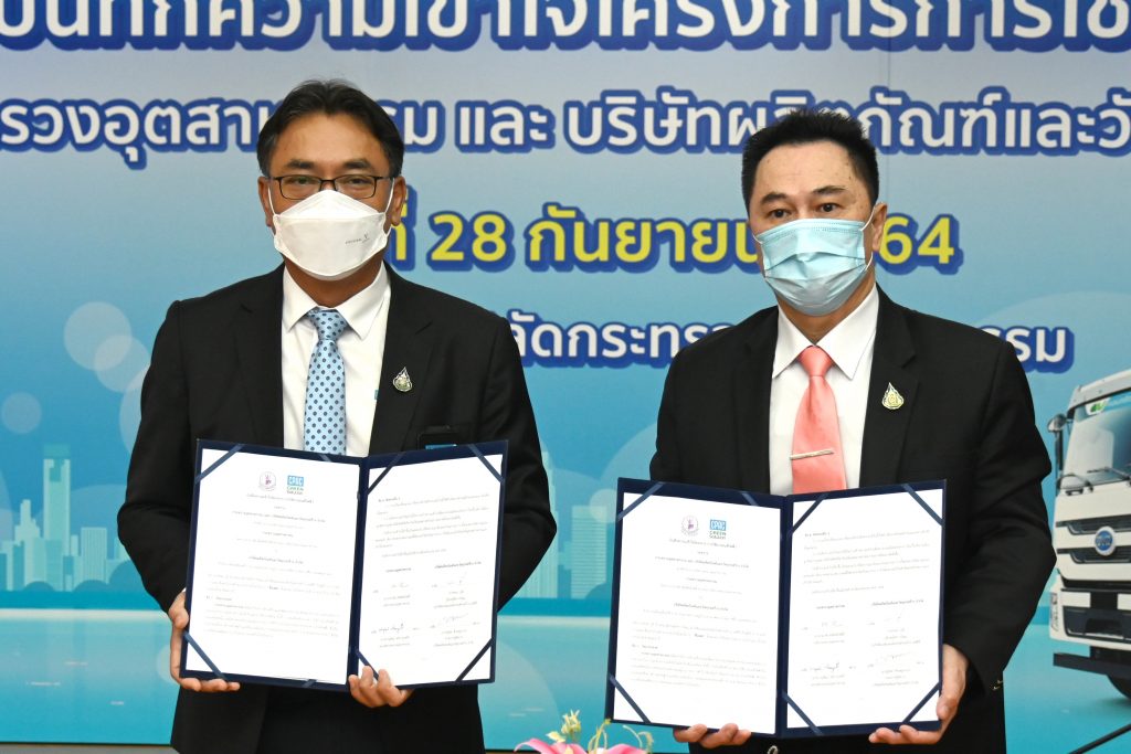 นายกอบชัย สังสิทธิสวัสดิ์ ปลัดกระทรวงอุตสาหกรรม และ นายชนะ ภูมี ผู้ช่วยผู้จัดการใหญ่ ธุรกิจซีเมนต์และผลิตภัณฑ์ก่อสร้าง เอสซีจี ร่วมพิธีลงนามบันทึกความเข้าใจโครงการการใช้ยานยนต์ไฟฟ้า ระหว่างกระทรวงอุตสาหกรรม และ บริษัท ผลิตภัณฑ์และวัตถุก่อสร้าง จำกัด ว่าด้วยความร่วมมือของภาครัฐกับองค์กรธุรกิจภาคเอกชน ในโครงการการใช้ยานยนต์พลังงานไฟฟ้าที่รัฐบาลสนับสนุนส่งเสริมให้เกิดการลงทุนในภาคเอกชน กระตุ้นให้เกิดการใช้ยานยนต์พลังงานไฟฟ้าในภาคอุตสาหกรรมมากขึ้น เป็นประโยชน์ ทั้งทางด้านเศรษฐกิจ สังคม และสิ่งแวดล้อม ในการลดฝุ่นละอองขนาดเล็กกว่า 2.5 ไมครอน (PM 2.5) ที่เกิดจากการสันดาปภายในของเครื่องยนต์ทั่วไป
