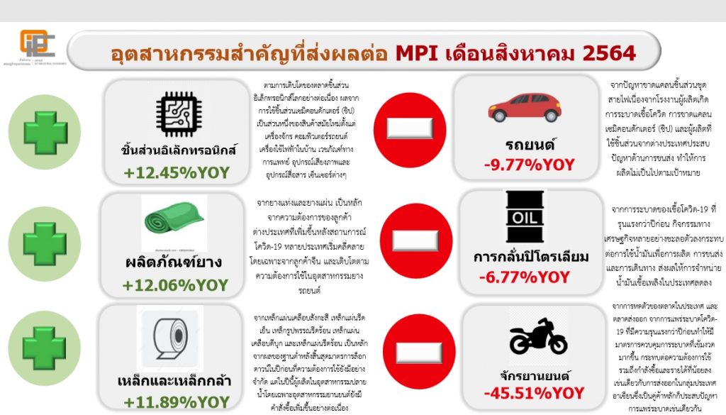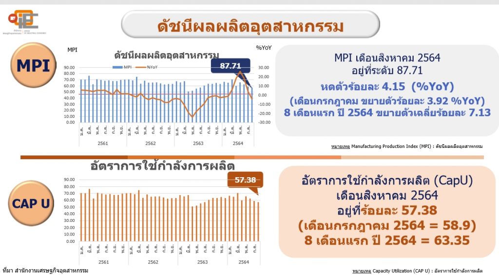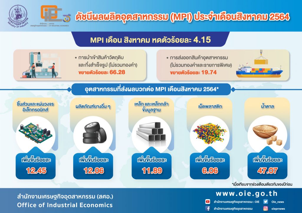 นายทองชัย ชวลิตพิเชฐ ผู้อำนวยการสำนักงานเศรษฐกิจอุตสาหกรรม (สศอ.) กล่าวว่า ดัชนีผลผลิตอุตสาหกรรม (MPI) เดือนสิงหาคม 2564 อยู่ที่ระดับ 87.71 หดตัวลดลงร้อยละ 4.15 เมื่อเทียบกับเดือนเดียวกันของปีก่อน เนื่องจากสถานการณ์การแพร่ระบาดโควิด-19 ของแรงงานในสถานประกอบการ ส่งผลกระทบต่อการจ้างงานและการผลิตภาคอุตสาหกรรมในภาพรวม สะท้อนได้จากดัชนีแรงงานอุตสาหกรรม เดือนสิงหาคม 2564 หดตัวเล็กน้อยร้อยละ 2.52 คาดว่าจะกลับมาฟื้นตัวได้ในระยะเวลาที่รวดเร็ว อย่างไรก็ตามดัชนีแรงงานในอุตสาหกรรมหลักยังขยายตัว อาทิ ยานยนต์ ชิ้นส่วนอิเล็กทรอนิกส์ เครื่องใช้ไฟฟ้า นอกจากนี้ ดัชนีผลผลิตอุตสาหกรรมที่หดตัวลงเป็นผลจากการขาดแคลนชิปที่มีการผลิตลดลงทั่วโลกในช่วงการแพร่ระบาดโควิด-19 ส่งผลกระทบต่อการผลิตและการจำหน่าย ในอุตสาหกรรมสำคัญ อาทิ อุตสาหกรรมการผลิตรถยนต์