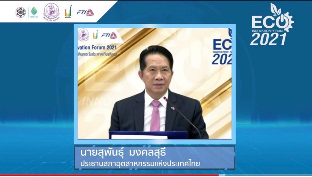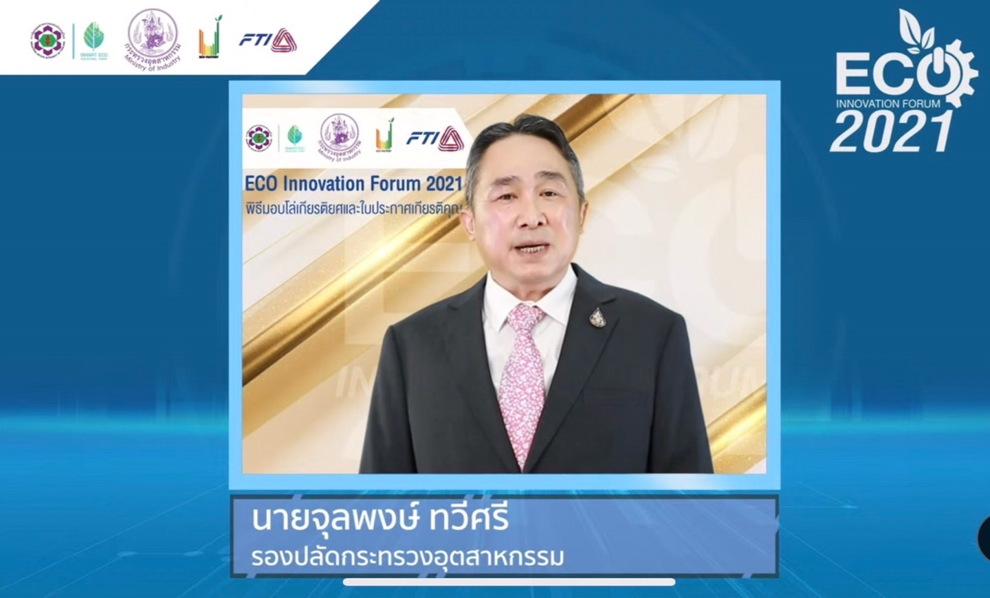 นายจุลพงษ์ ทวีศรี รองปลัดกระทรวงอุตสาหกรรม เป็นประธานในพิธีเปิดงาน “ECO Innovation Forum 2021” พร้อมมอบนโยบายทิศทางการขับเคลื่อนอุตสาหกรรมไทยด้วย BCG Model ซึ่งเป็นความร่วมมือระหว่างการนิคมอุตสาหกรรมแห่งประเทศไทย (กนอ.) และ สภาอุตสาหกรรมแห่งประเทศไทย (ส.อ.ท.) ว่า กระทรวงอุตสาหกรรม ร่วมกับสภาอุตสาหกรรมแห่งประเทศไทย กำหนดกลไกการดำเนินงานร่วม โดยการตั้งคณะกรรมการอำนวยการขับเคลื่อนเศรษฐกิจภาคอุตสาหกรรม นอกจากนี้ ยังมีกลไกขับเคลื่อนร่วมกับคณะกรรมการร่วมภาคเอกชน เพื่อขับเคลื่อนการดำเนินงานด้านการพัฒนาเศรษฐกิจใหม่ BCG Economy Model โดยเฉพาะประเด็นของเศรษฐกิจหมุนเวียน (Circular Economy) และเศรษฐกิจสีเขียว (Green Economy) ให้เกิดขึ้น ในการส่งเสริมและสนับสนุนการพัฒนาอุตสาหกรรมไทยให้เติบโตอย่างมั่นคง มั่งคั่งและยั่งยืน การพัฒนาอุตสาหกรรมด้วยเทคโนโลยีและนวัตกรรม มีส่วนสำคัญช่วยเพิ่มประสิทธิภาพการดำเนินงานด้านการบริหารจัดการและควบคุมกระบวนการผลิตและการใช้ทรัพยากรและวัตถุดิบอย่างคุ้มค่าและเกิดประโยชน์สูงสุด