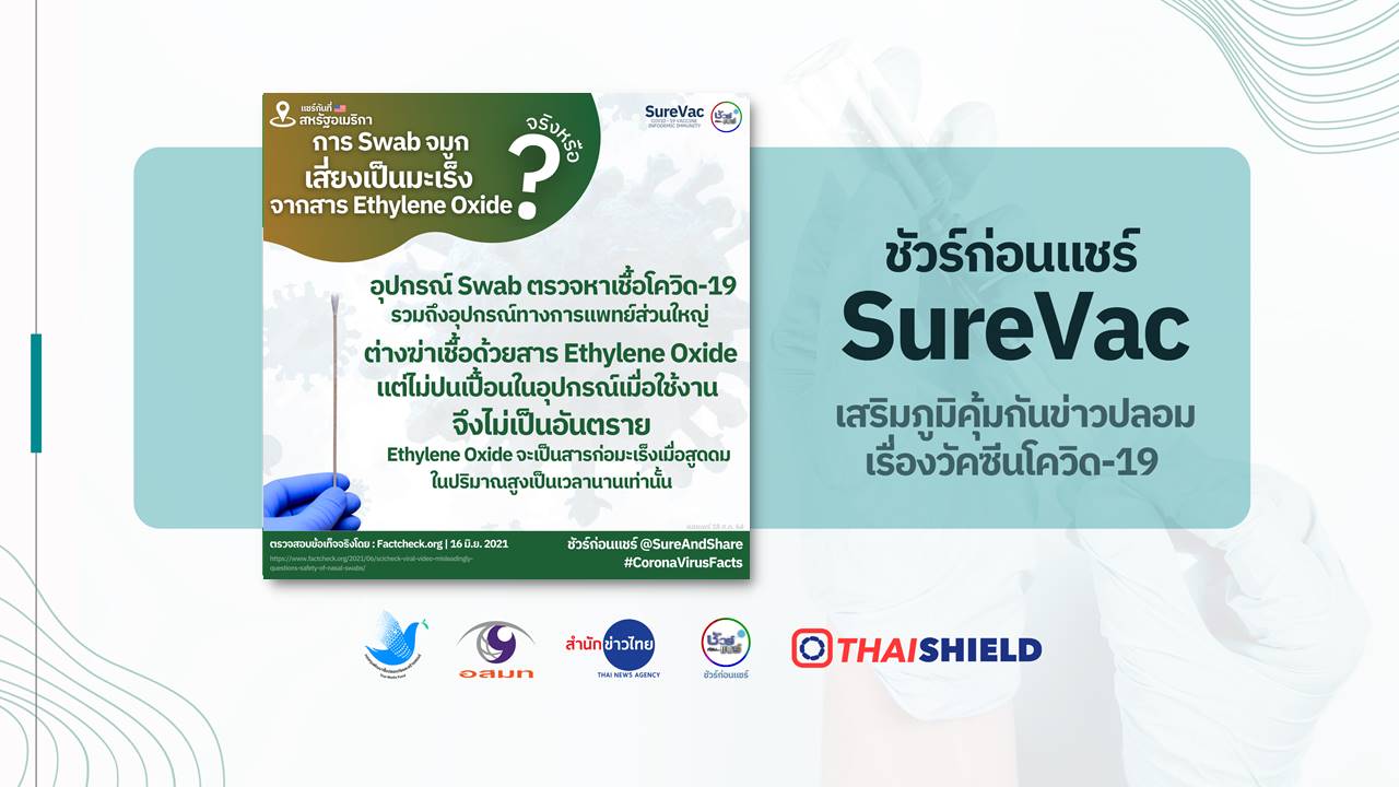 - อุปกรณ์ Swab ตรวจหาเชื้อโควิด 19 รวมถึงอุปกรณ์ทางการแพทย์ส่วนใหญ่ ต่างฆ่าเชื้อด้วยสาร Ethylene Oxide แต่ไม่ปนเปื้อนในอุปกรณ์เมื่อใช้งานจึงไม่เป็นอันตราย