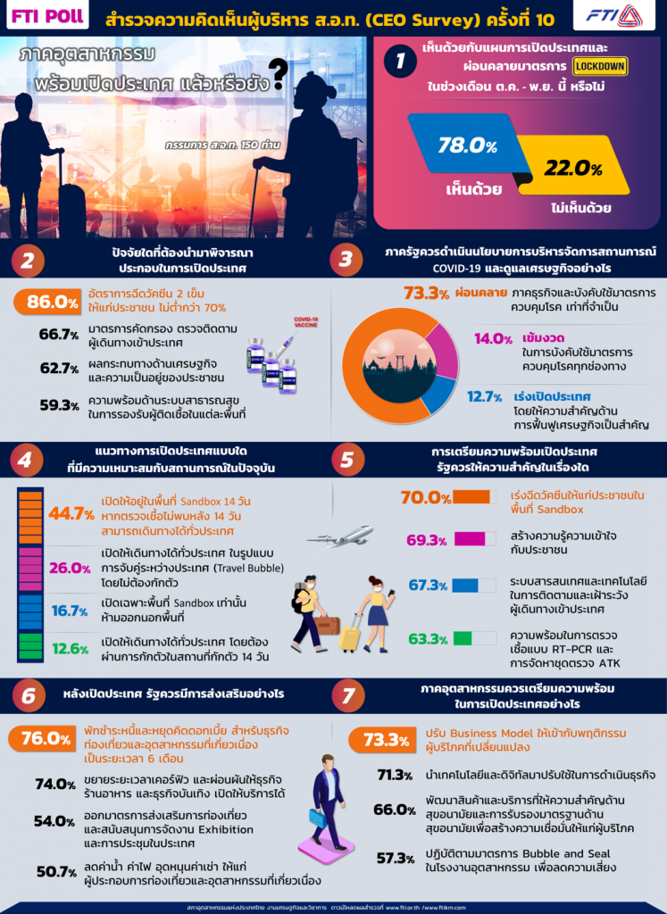 จากการสำรวจผู้บริหาร ส.อ.ท. (CEO Survey) จำนวน 150 ทคน ครอบคลุมผู้บริหารจาก 45 กลุ่มอุตสาหกรรม และ 76 สภาอุตสาหกรรมจังหวัด มีสรุปผลการสำรวจ FTI Poll ครั้งที่ 10 จำนวน 7 คำถาม ดังนี้