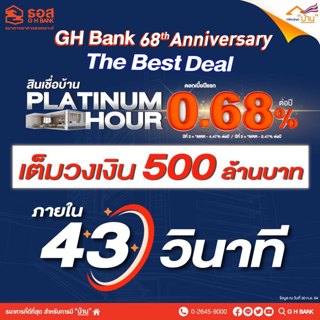 นายฉัตรชัย ศิริไล กรรมการผู้จัดการ ธนาคารอาคารสงเคราะห์ (ธอส.) เปิดเผยว่า ตามที่วานนี้ (29 กันยายน 2564) ธนาคารได้จัดโปรโมชั่น GH Bank 68th Anniversary เนื่องในโอกาสครบรอบการดำเนินงาน 68 ปี ของธนาคารด้วยสินเชื่อบ้านอัตราดอกเบี้ยพิเศษ 2 ต่อ โดยต่อที่ 1 สินเชื่อ The Best Deal อัตราดอกเบี้ยปีที่ 1 เท่ากับ 2.60% ต่อปี เฉลี่ยอัตราดอกเบี้ย 3 ปีแรก เท่ากับ 2.917% จองสิทธิ์ตั้งแต่วันที่ 24 กันยายน ถึง 29 กันยายน 2564 เวลา 14.00 น.และต่อที่ 2 สินเชื่อ Platinum Hour อัตราดอกเบี้ยปีที่ 1 เท่ากับ 0.68% ต่อปี เฉลี่ยอัตราดอกเบี้ย 3 ปีแรก เพียง 2.013% เท่านั้น