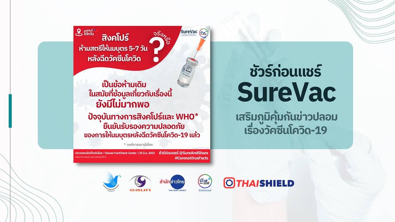 การตรวจสอบของ Taiwan FactCheck Center พบว่า กระทรวงสาธารณสุขสิงคโปร์เคยห้ามไม่ให้ผู้หญิงที่ฉีดวัคซีนโควิด 19 ให้นมลูกเป็นเวลา 5 ถึง 7 วันมาก่อน แต่เป็นข้อแนะนำเก่าที่โพสต์ทางเว็บไซต์ของกระทรวงตั้งแต่วันที่ 31 มกราคม 2021 ซึ่งเป็นช่วงที่ข้อมูลเกี่ยวกับวัคซีนโควิด 19 กับสตรีให้นมลูกยังมีไม่มากพอ