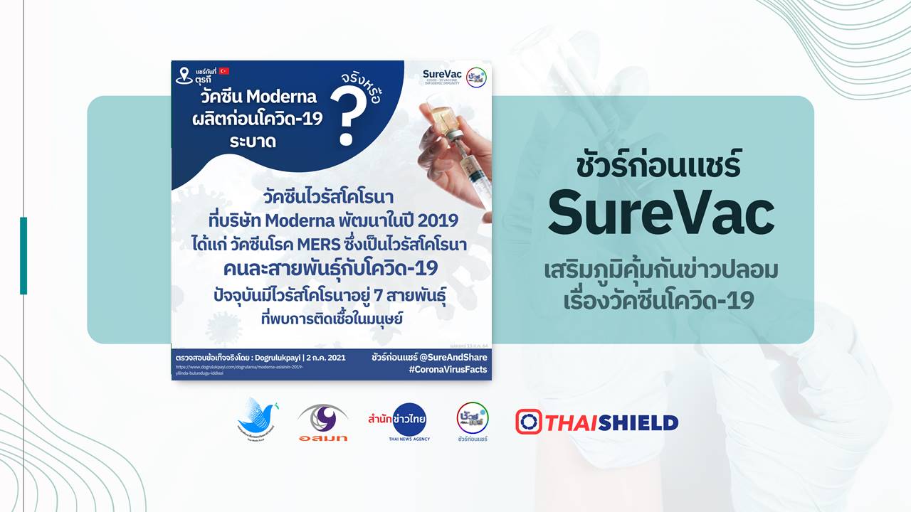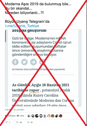 มีข้อมูลเท็จเผยแพร่ทางสื่อสังคมออนไลน์ในประเทศตุรกี โดยอ้างว่าพบหลักฐานที่บริษัท Moderna เริ่มผลิตวัคซีนโควิด 19 ตั้งแต่ปี 2019 หรือก่อนที่ไวรัสโควิด 19 จะแพร่ระบาดไปทั่วโลก