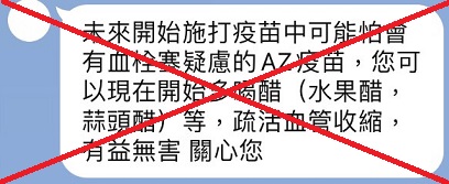 มีข้อมูลเท็จเผยแพร่ทางสื่อสังคมออนไลน์ในไต้หวัน โดยอ้างว่าผู้ที่จะเข้ารับการฉีดวัคซีนโควิด 19 ของบริษัท Astrazeneca ควรจะดื่มน้ำส้มสายชูหมัก (Vinegar) เพื่อลดความเสี่ยงการเกิดลิ่มเลือดอุดตันจากวัคซีน ไม่ว่าจะเป็นน้ำส้มสายชูหมักจากผลไม้หรือน้ำส้มสายชูหมักจากกระเทียมดำ เนื่องจากมีสรรพคุณลดการหดตัวของหลอดเลือด (Vasoconstriction)