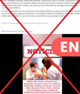 มีข้อมูลเท็จเผยแพร่ทาง Facebook ในประเทศบราซิล เมื่อแพทย์ผู้หนึ่งเผยแพร่คลิปวิดีโอโจมตีประสิทธิผลของวัคซีนโควิด 19 ของบริษัท Sinovac โดยอ้างผลตรวจแอนตีบอดี้ในเลือดหลังจากฉีดวัคซีน Sinovac ครบ 2 โดส พบว่าระดับภูมิต้านทานเชื้อไวรัสโควิด 19 อยู่ในระดับต่ำ