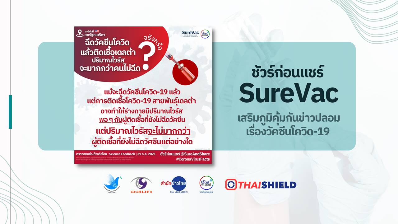 แม้จะฉีดวัคซีนโควิด 19 แล้ว แต่การติดเชื้อโควิด 19 สายพันธุ์เดลต้า อาจทำให้ร่างกายมีปริมาณไวรัสพอๆ กับผู้ติดเชื้อที่ยังไม่ฉีดวัคซีน แต่ปริมาณไวรัสจะไม่มากกว่าผู้ติดเชื้อที่ยังไม่ฉีดวัคซีนแต่อย่างใด