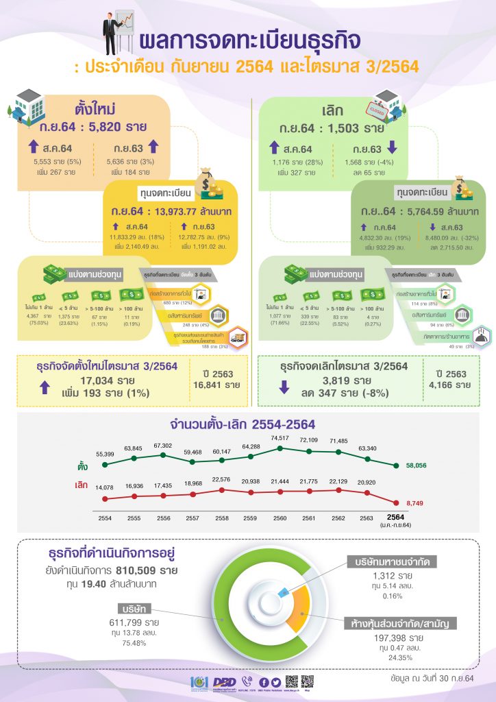 นายทศพล ทังสุบุตร อธิบดีกรมพัฒนาธุรกิจการค้า กล่าวถึงยอดจดทะเบียนธุรกิจจัดตั้งนิติบุคคลทั่วประเทศประจำเดือนกันยายน 2564 และไตรมาส 3/2564 โดยธุรกิจจัดตั้งใหม่เดือนกันยายน 2564มีจำนวน 5,820 ราย เพิ่มขึ้นร้อยละ 3 มีมูลค่าทุนจดทะเบียนถึง 13,973.77 ล้านบาท ซึ่งมีประเภทธุรกิจจัดตั้งใหม่สูงสุด 3 อันดับแรก ได้แก่ ธุรกิจก่อสร้างอาคารทั่วไป จำนวน 680 ราย คิดเป็นร้อยละ 12 รองลงมา คือ ธุรกิจอสังหาริมทรัพย์ จำนวน 248 ราย คิดเป็นร้อยละ 4 และอันดับ 3 คือ ธุรกิจขนส่งและขนถ่ายสินค้ารวมถึง คนโดยสาร จำนวน 188 ราย คิดเป็นร้อยละ 3 ตามลำดับ ส่งผลให้ธุรกิจจัดตั้งใหม่ไตรมาส 3/2564 มีจำนวน 17,034 ราย เพิ่มขึ้นเมื่อเทียบกับช่วงเดียวกันปีก่อน 16,841 ราย เพิ่มขึ้นร้อยละ 1 แบ่งเป็นประเภทธุรกิจจัดตั้งใหม่สูงสุด 3 อันดับแรก ได้แก่ ธุรกิจก่อสร้างอาคารทั่วไป จำนวน 1,929 ราย คิดเป็นร้อยละ 11 รองลงมา คือ ธุรกิจอสังหาริมทรัพย์ จำนวน 725 ราย คิดเป็นร้อยละ 4 และธุรกิจขนส่งและขนถ่ายสินค้ารวมถึงคนโดยสาร จำนวน 622 ราย คิดเป็นร้อยละ 4 ตามลำดับ โดยมีทุนธุรกิจจัดตั้งใหม่ มีจำนวนทั้งสิ้น 39,350.24 ล้านบาท เมื่อเทียบกับไตรมาส 3/2563 จำนวน 43,813.68 ล้านบาท ลดลงจำนวน 4,463.44 ล้านบาท คิดเป็น ร้อยละ 10