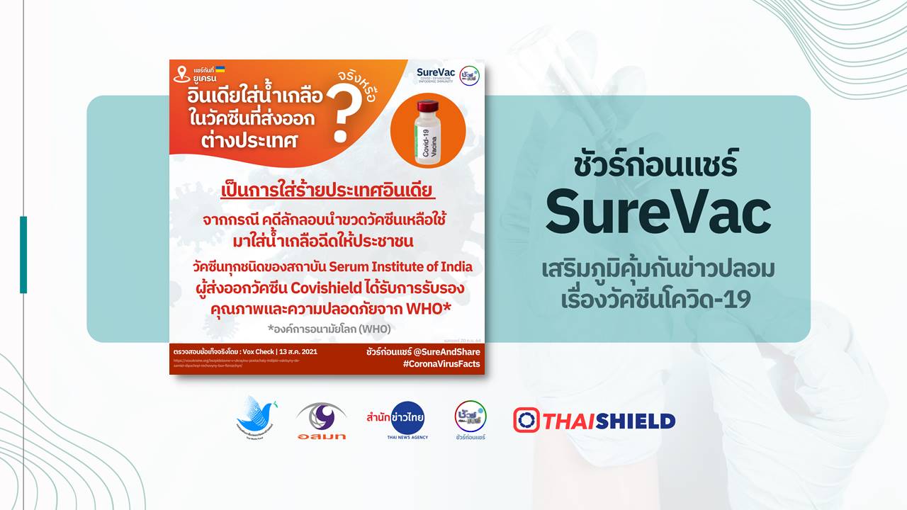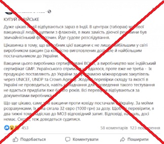 มีข้อมูลเท็จเผยแพร่ทาง Facebook ในประเทศยูเครน โดยอ้างว่ายูเครนนำเข้าวัคซีนที่มีแต่น้ำเกลือเป็นส่วนผสมจากประเทศอินเดีย