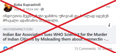 มีข้อมูลบิดเบือนเผยแพร่ทาง Facebook ในประเทศจอร์เจีย โดยอ้างว่า สมญา สวามินาธาน หัวหน้านักวิทยาศาสตร์ องค์การอนามัยโลก พยายามปกปิดสรรพคุณการรักษาโควิด 19 ของยา Ivermectin เพื่อเอื้อประโยชน์ให้บริษัทผู้ผลิตวัคซีนโควิด 19 จนถูกดำเนินคดีในข้อหาเผยแพร่ข้อมูลเท็จเกี่ยวกับยา Ivermectin ในประเทศอินเดีย
