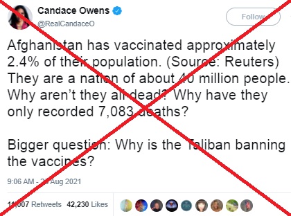 มีข้อมูลเท็จเผยแพร่ทางสื่อสังคมออนไลน์ในสหรัฐอเมริกา โดยอ้างว่ากองกำลังติดอาวุธกลุ่มตาลีบัน ที่ยึดครองประเทศอัฟกานิสถานตั้งแต่เดือนสิงหาคม ออกคำสั่งห้ามฉีดวัคซีนโควิด 19 แก่ประชาชนในประเทศ สื่อให้เห็นว่าวัคซีนไม่เป็นที่ต้องการ เพราะแม้อัตราการฉีดวัคซีนในประเทศจะต่ำมาก แต่ยอดการเสียชีวิตจากโควิด 19 ในอัฟกานิสถานถือว่าน้อยกว่าหลายประเทศที่ฉีดวัคซีนกันอย่างแพร่หลาย