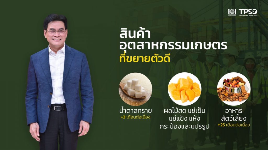 ทั้งนี้ หากดูกลุ่มสินค้าที่เติบโตต่อเนื่อง ไม่ว่าจะเป็นสินค้าเกษตรในเดือน ตค 64 เติบโตถึงร้อยละ 22.5 สินค้าอุตสาหกรรมเกษตรเติบโตถึงร้อยละ 13.5 สินค้าอุตสาหกรรมเติบโตถึงร้อยละ 13 9 ซึ่งเป็นอัตราการเติบโตต่อเนื่องมาโดยตลอด ไม่ว่าจะเป็นกลุ่มผลไม้สด ยางพารา มันสำปะหลังหรือแม้แต่ข้าวเริ่มส่งออกในปริมาณที่เพิ่มขึ้น ทำให้ขณะนี้ข้าวไทยส่งออกในช่วง 10 เดือนมากกว่า 4.59 ล้านตัน คิดเป็นมูลค่ากว่า 2,605 ล้านดอลลาร์สหรัฐ โดยคิดเป็นมูลค่าเป็นบวกร้อยละ 2.95 แต่หากคิดเป็นปริมาณถือว่าน้อยอยู่ แต่ยังมั่นใจว่าข้าวไทยในปีนี้จะส่งออกได้ไม่น้อยกว่า 6 ล้านตันแน่นอน