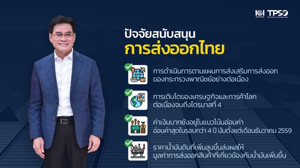 ทั้งนี้ กระทรวงพาณิชย์คาดว่าการส่งออกไทยในช่วงที่เหลือปีนี้ หรืออีก 2 เดือน คือ พย-ธค 64 น่าจะส่งออกยังเติบโตเฉลี่ยแต่ละเดือนไม่น้อวกว่าร้อยละ 17 หรือมีมูลค่ากว่า 22,000 ล้านดอลลาร์สหรัฐ ซึ่งจะทำให้โอกาสตัวเลขการส่งออกของไทยในปีนี้ขยายตัวกว่า 4 เท่าจากเป้าหมายเดิมคาดว่าตัวเลขส่งออกไทยในปี 64 จะเติบโตไม่น้อยกว่าน้อยละ 4 โดยจะมีอัตราการเติบโตถึงร้อยละ 15-16 หรือมีมูลค่าอยูที่ 266,379-268,696 ล้านดอลลาร์สหรัฐ ส่วนตัวเลขส่งออกในปี 65 จะมีการประชุมในกรอบ กรอ.พาณิชย์ก่อน คาดว่าน่าจะประกาศเป้าหมายตัวเลขส่งออกในปี 65 ได้ในเร็วๆนี้ และเหตุผลสำคัญที่ทำให้ภาคตัวเลขการส่งออกของไทยดีขึ้นต่อเนื่องมาจากความร่วมมือของภาครัฐและเอกชนที่ร่วมกันทำตลาดทั้งตลาดหลักและตลาดรองได้เป็นผลสำเร็จอย่างมาก