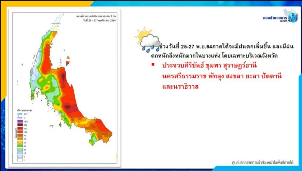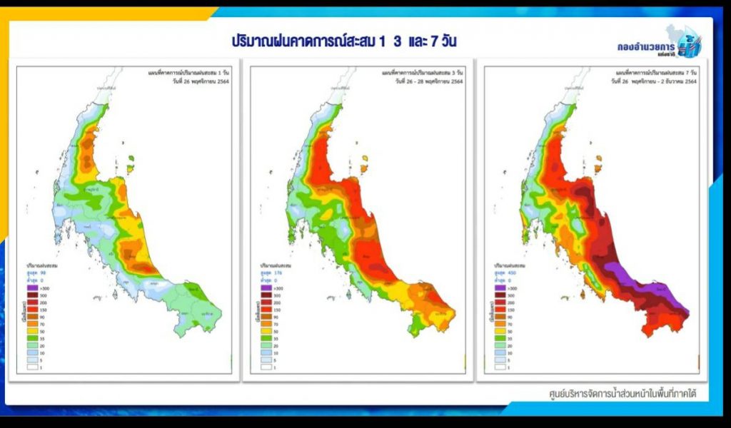 นายฐนโรจน์ วรรัฐประเสริฐ รองโฆษกสำนักงานทรัพยากรน้ำแห่งชาติ (สทนช.) กองอำนวยการน้ำแห่งชาติ (กอนช.) ศูนย์บริหารจัดการน้ำส่วนหน้าในพื้นที่ภาคใต้กำชับให้หน่วยงานที่เกี่ยวข้องเฝ้าระวังน้ำหลาก น้ำท่วมฉับพลัน และน้ำล้นตลิ่งเนื่องจากฝนตกหนักมาหลายวัน แล้วยังคงตกต่อเนื่องระหว่างวันที่ 26-30 พ.ย. เนื่องจากบริเวณความกดอากาศสูงหรือมวลอากาศเย็นกำลังค่อนข้างแรงระลอกใหม่จากประเทศจีนจะแผ่เสริมลงปกคลุมประเทศไทยตอนบนและทะเลจีนใต้ ประกอบกับมรสุมตะวันออกเฉียงเหนือที่พัดปกคลุมอ่าวไทยและภาคใต้ยังคงมีกำลังแรง รวมถึงมีหย่อมความกดอากาศต่ำกำลังแรงบริเวณทะเลจีนใต้ตอนล่างจะเคลื่อนเข้าปกคลุมภาคใต้ซึ่งฝนจะตกซ้ำในพื้นที่ที่ตกอยู่ในระยะนี้