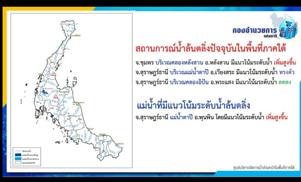 ปัจจุบัน หลายพื้นที่มีระบบระบายน้ำไม่ดี รวมทั้งภาวะน้ำทะเลหนุนสูงทำให้ระบายน้ำได้ช้า พื้นที่ที่มีน้ำล้นตลิ่งแล้วได้แก่ จ.ชุมพร บริเวณคลองหลังสวน อ.หลังสวน ซึ่งระดับน้ำมีแนวโน้ม เพิ่มสูงขึ้น จ.สุราษฎร์ธานี บริเวณแม่น้ำตาปี อ.เวียงสระ อ. ท่าชนะ และอ.พุนพินซึ่งอาจล้นตลิ่งต่อไป บริเวณคลองอิปัน อ.พระแสง