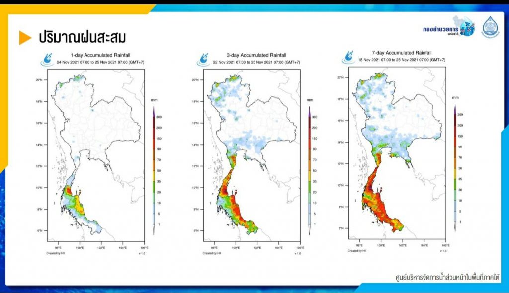 จากการตรวจวัดปริมาณฝนตกสะสมสูงสุดรอบ 24 ชั่วโมง ณ เวลา 10.00 น. วันนี้ (25 พ.ย.) พื้นที่ที่ตกเกินกว่า 100 มม. ได้แก่ อ.ละแม จ.ชุมพร 172 มม. อ.พะโต๊ะ จ.ชุมพร 118 มม. อ.ท่าชนะ จ.สุราษฎร์ธานี 143 มม. อ.พิปูน จ.นครศรีธรรมราช 120 มม. แม้หลายพื้นที่ปริมาณฝนสะสมจะไม่ถึง 100 มม. แต่จำเป็นต้องเฝ้าระวังอย่างใกล้ชิดด้วยเพราะตกต่อเนื่อง 3-7 วันที่ผ่านมาจนดินชุ่มน้ำ รวมทั้งหลายพื้นที่มีระบบระบายน้ำไม่ดีเช่น ดังนั้น กอนช. จึงแจ้งเตือนดังนี้