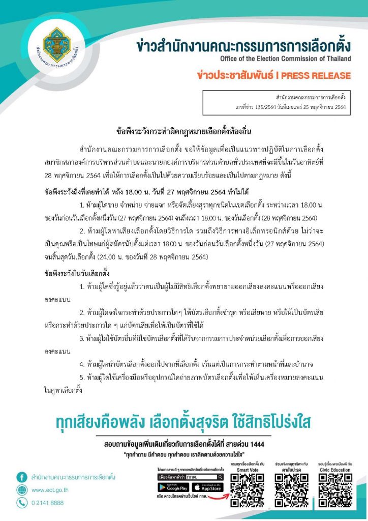 สำนักงาน กกต. 25 พ.ย. – กกต.เตือนระวังทำผิดกฎหมาย โค้งสุดท้ายเลือกตั้ง อบต.28 พ.ย.นี้ งดจำหน่ายจ่ายแจกสุรา – จัดเลี้ยงก่อนวันเลือกตั้ง
