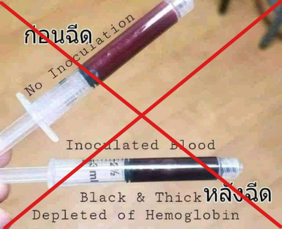 มีการเผยแพร่ภาพข่าวจาก “กรุงเทพธุรกิจ” พร้อมภาพเลือดในหลอดฉีดยาที่เป็นสีดำ และอ้างว่าเป็นเลือดก่อนและหลังการฉีดวัคซีน ทำให้เกิดวิกฤติขาดแคลนเลือด เนื่องจากเลือดของผู้บริจาคที่ฉีดวัคซีนมีสีดำ