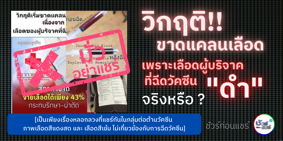- ข้อความที่แชร์กันระบุว่า “เลือดมันดำคล้ำเป็นพิษใช้ไม่ได้…” “คนไม่ฉีดวัคซีน กาชาดต้องการ” นั้น ตรวจสอบกับ ศ.นพ.อิศรางค์ นุชประยูร ที่ปรึกษาด้านวิชาการ ศูนย์บริการโลหิตแห่งชาติ สภากาชาดไทย ยืนยันว่า ชุดข้อความดังกล่าว รวมทั้งภาพเลือดที่แชร์กัน ไม่เป็นความจริงแต่อย่างใด