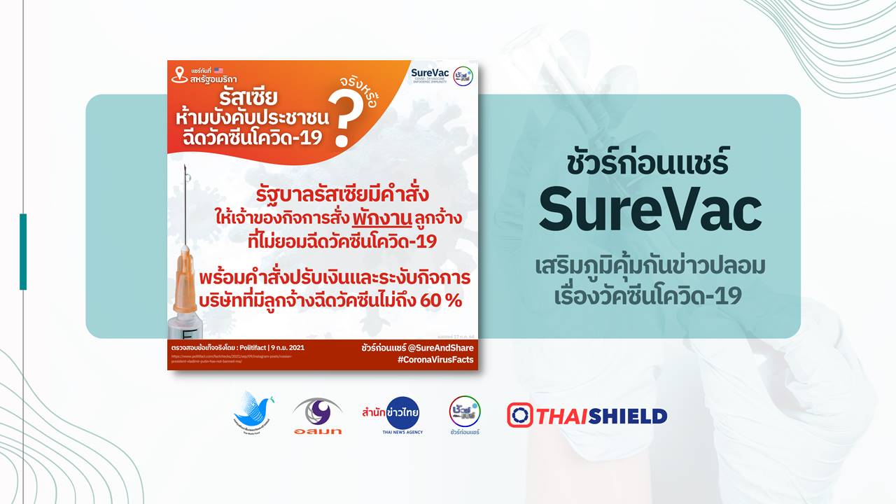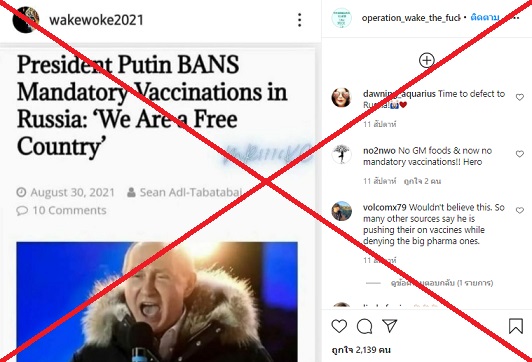 มีข้อมูลเท็จเผยแพร่ทาง Instagram ในสหรัฐอเมริกา โดยอ้างว่า วลาดิเมียร์ ปูติน ประธานาธิบดีของรัสเซีย ออกคำสั่งห้ามบังคับประชาชนฉีดวัคซีนโควิด 19 ซึ่งเป็นข้ออ้างเพื่อโจมตี โจ ไบเดน ประธานาธิบดีสหรัฐฯ ที่ออกคำสั่งให้เจ้าหน้าที่รัฐบาลและลูกจ้างรัฐบาลสหรัฐฯ หลายล้านคน ต้องเข้ารับการฉีดวัคซีนโควิด 19 ทุกคน