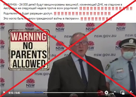 มีข้อมูลเท็จเผยแพร่ทาง Facebook ในประเทศยูเครน โดยอ้างว่าทางการออสเตรเลียออกคำสั่งให้เด็กนักเรียนในประเทศฉีดวัคซีนโควิด 19 พร้อมกันมากกว่า 24,000 คน โดยเป็นการบังคับฉีดวัคซีนโดยไม่ฟังความเห็นจากเด็ก และยังกีดกันผู้ปกครองไม่เข้าไปในบริเวณที่มีการฉีดวัคซีนอีกด้วย