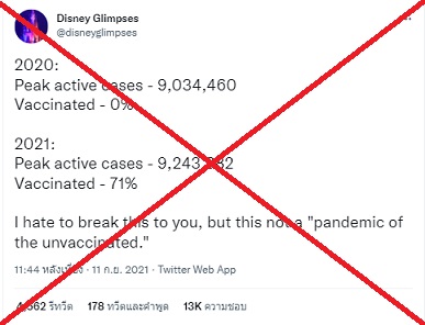 มีข้อมูลเท็จเผยแพร่ทาง Facebook ในสหรัฐอเมริกา โดยอ้างว่ายอดการติดเชื้อโควิด 19 เมื่อปี 2020 ซึ่งวัคซีนยังไม่ผลิตออกมา เมื่อเทียบกับยอดการติดเชื้อโควิด 19 ในปี 2021 ซึ่งมีการฉีดวัคซีนไปแล้วกว่า 71% กลับพบว่าจำนวนผู้ติดเชื้อโควิด 19 แทบจะไม่ต่างกัน แปลว่าการระบาดในปี 2021 มีปัจจัยจากการแพร่เชื้อของผู้ที่ฉีดวัคซีนแล้วแต่กลับมาติดเชื้ออีกครั้ง