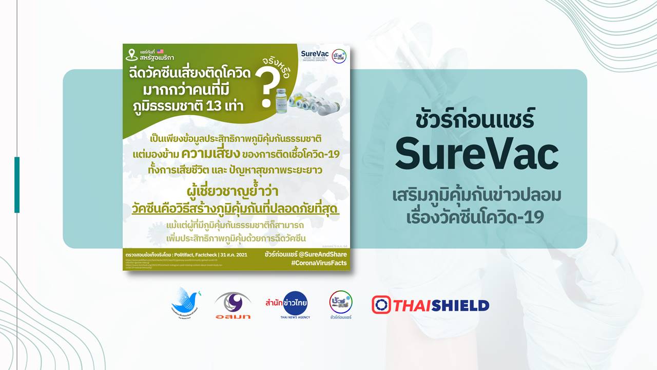 มีข้อมูลบิดเบือนเผยแพร่ทางสื่อสังคมออนไลน์ในสหรัฐอเมริกา โดยกลุ่มที่มีแนวคิดต่อต้านวัคซีนในสหรัฐฯ อ้างว่าคนที่ฉีดวัคซีนโควิด 19 ครบ 2 โดส มีโอกาสติดเชื้อโควิด 19 มากกว่าคนที่มีภูมิคุ้มกันจากการติดเชื้อโควิด 19 ถึง 13 เท่า แสดงให้เห็นว่าภูมิคุ้มกันจากวัคซีนสู้ภูมิกันธรรมชาติไม่ได้