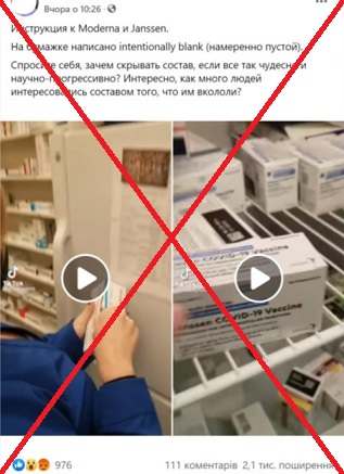 มีคลิปวิดีโอบิดเบือนข้อมูลเผยแพร่ทาง Facebook ในประเทศยูเครน โดยอ้างว่าบริษัท Moderna และ Johnson & Johnson พยายามปกปิดข้อมูลเกี่ยวกับวัคซีนของตนเอง เนื่องจากปล่อยให้ฉลากในกล่องวัคซีนเป็นแผ่นกระดาษว่างเปล่า แทนที่จะพิมพ์ข้อมูลที่จำเป็นเกี่ยวกับวัคซีนลงไป