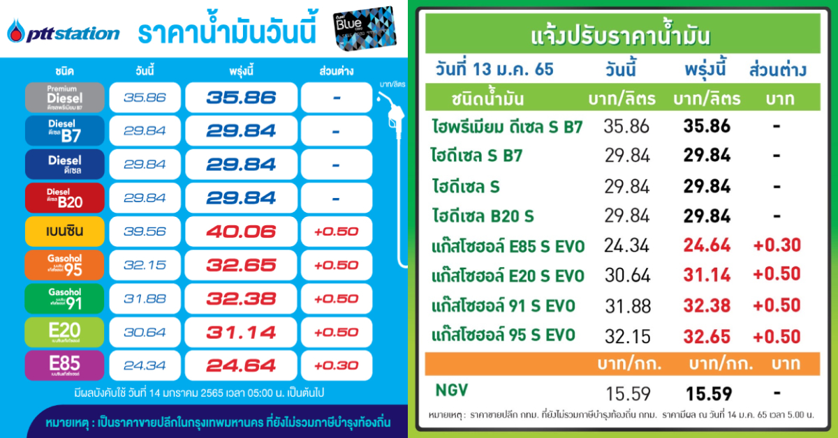 กรุงเทพฯ 13 ม.ค. – PTT Station และบางจากฯ ปรับราคาขายปลีกน้ำมันเบนซินและแก๊สโซฮอล์ทุกชนิดขึ้น 0.50 บาท/ลิตร เว้น E85 ปรับขึ้น 0.30 บาท/ลิตร ส่วนกลุ่มดีเซลทุกชนิดคงเดิม มีผล 14 ม.ค.65 เวลา 05.00 น. เป็นต้นไป