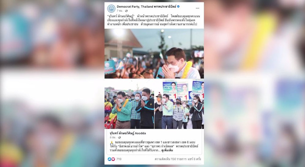 ด้านนายจุรินทร์ ลักษณวิศิษฏ์ หัวหน้าพรรคประชาธิปัตย์ โพสต์เฟซบุ๊ก “จุรินทร์ ลักษณวิศิษฏ์ Aoodda” ระบุว่า ขอขอบคุณทุกคะแนนที่ชาวชุมพร เขต 1 และชาวสงขลา เขต 6 มอบให้กับ “อิสรพงษ์ มากอำไพ” และ “สุภาพร กำเนิดผล” พรรคประชาธิปัตย์ รวมทั้งขอขอบคุณทุกกำลังใจที่ได้รับจากผู้สนับสนุนที่หลั่งไหลมาจากหลายพื้นที่ทั่วประเทศ ด้วยความซาบซึ้งใจยิ่ง ในฐานะหัวหน้าพรรค ผมขอยืนยันว่า พรรคจะตั้งใจ ทุ่มเท ทำงานหนัก เพื่อชาวชุมพร ชาวสงขลา พี่น้องชาวใต้ และพี่น้องคนไทยทั่วประเทศ ด้วยอุดมการณ์ จนสุดกำลังความสามารถต่อไป ให้สมกับที่ได้รับความไว้วางใจครับ