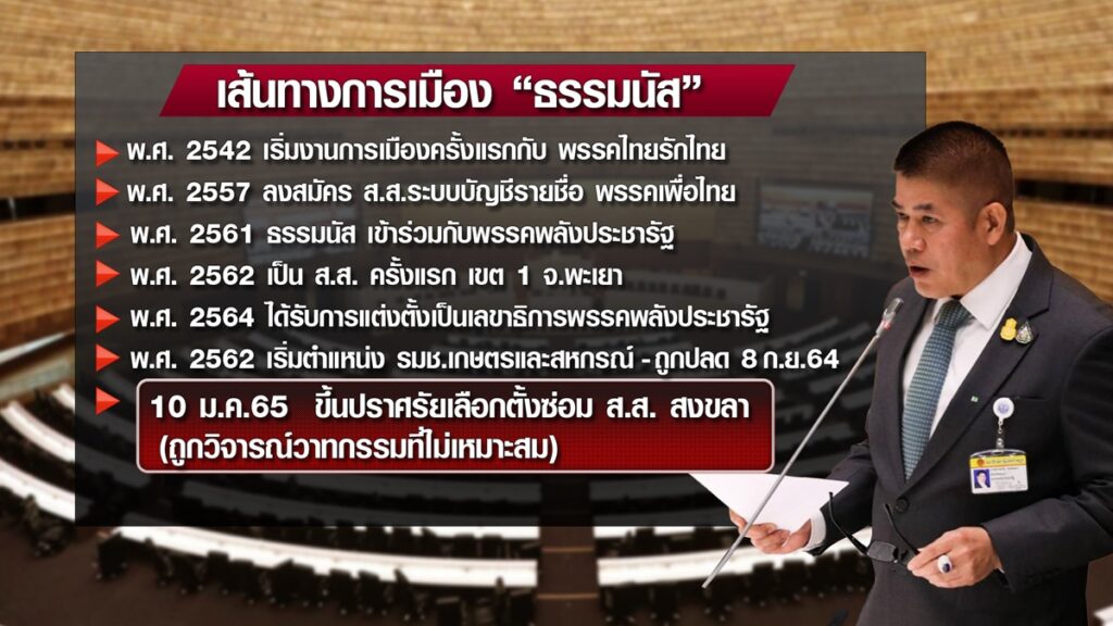 กรุงเทพฯ 20 ม.ค. – พรรคพลังประชารัฐ มีมติขับ ร.อ.ธรรมนัส พรหมเผ่า พร้อมกับก๊วน ส.ส. รวม 21 คน ออกจากพรรค เมื่อช่วงค่ำวานนี้ (19 ม.ค.) เหตุผิดวินัย ผิดจรรยาบรรณร้ายแรง ทำให้พรรคบริหารงานไม่มีประสิทธิภาพ และเพื่อแก้ไขปัญหาความขัดแย้งภายในพรรค ย้อนดูประวัติและเส้นทางการเมืองของ “ร.อ.ธรรมนัส” พร้อมย้อนฟังวาทกรรมสำคัญที่ว่า “ร.อ.ธรรมนัส เป็นเส้นเลือดใหญ่ของรัฐบาล” – สำนักข่าวไทย