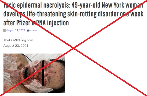 มีข้อมูลบิดเบือนเผยแพร่ผ่านทาง Facebook ในประเทศจอร์เจีย โดยอ้างว่าผู้หญิงชาวนิวยอร์กวัย 49 ปี มีอาการผิวหนังลอกจากอาการแพ้ยารุนแรง หลังฉีดวัคซีนโควิด 19 ของบริษัท Pfizer มาเป็นเวลาหนึ่งสัปดาห์