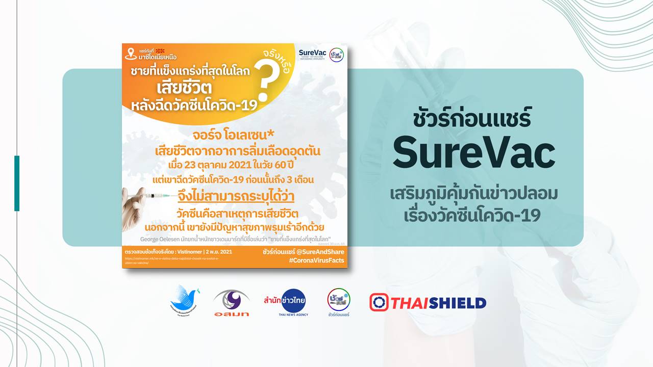 มีข้อมูลเท็จเผยแพร่ทาง Facebook ในประเทศมาซิโดเนียเหนือ โดยอ้างว่า จอร์จ โอเลเซน อดีตแชมป์นักยกน้ำหนักรุ่นซูเปอร์ เฮฟวีเวทปี 1983 ชาวเดนมาร์ก เจ้าของฉายา “ชายที่แข็งแกร่งที่สุดในโลก” เสียชีวิตจากอาการลิ่มเลือดอุดตันหลังฉีดวัคซีนโควิด 19