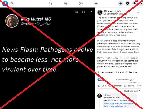 มีข้อมูลเท็จเผยแพร่ทาง Facebook ในสหรัฐอเมริกา โดยอ้างว่าเชื้อโรคที่กลายพันธุ์จะลดความรุนแรงของโรคไปเรื่อยๆ ถ้าเชื้อโรคกลายพันธุ์แล้วเพิ่มความรุนแรงยิ่งขึ้น โฮสต์หรือผู้รับเชื้อที่เชื้อโรคใช้พึ่งพิงจะเสียชีวิตกันหมด และมนุษย์อาจจะสูญพันธุ์ไปนานแล้ว โดยผู้โพสต์ยกตัวอย่างการแพร่ระบาดของไวรัสอีโบลา และการระบาดของไวรัส HIV ในประเทศยูกันดาที่ลดความรุนแรงลงเรื่อยๆ