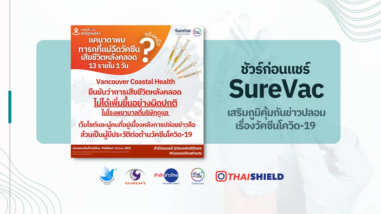 มีข้อมูลเท็จเผยแพร่ทาง Facebook ในสหรัฐอเมริกา โดยอ้างรายงานจากเว็บไซต์ Fox 26 News Henry เรื่องการเสียชีวิตหลังคลอดของเด็กทารก 13 คนในเวลาเพียง 1 วันเด็กที่โรงพยาบาล Lions Gate Hospital เมืองแวนคูเวอร์ ประเทศแคนาดา และยังพบว่าแม่ของทารกทุกคนฉีดวัคซีนโควิด 19