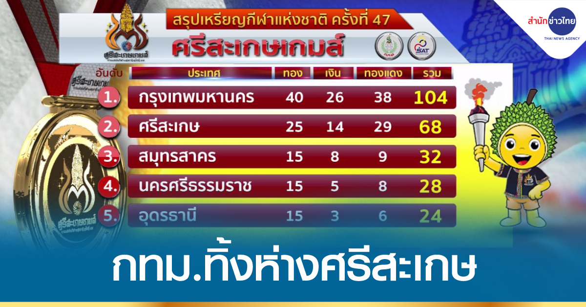 ศรีสะเกษ 14 มี.ค. – ความเคลื่อนไหวกีฬาแห่งชาติ ครั้งที่ 47 “ศรีสะเกษเกมส์” ล่าสุดวันนี้ (14 มี.ค.) ทัพนักกีฬาจากกรุงเทพฯ โกยเหรียญทิ้งห่างเจ้าภาพ ศรีสะเกษ 15 เหรียญทอง. – สำนักข่าวไทย