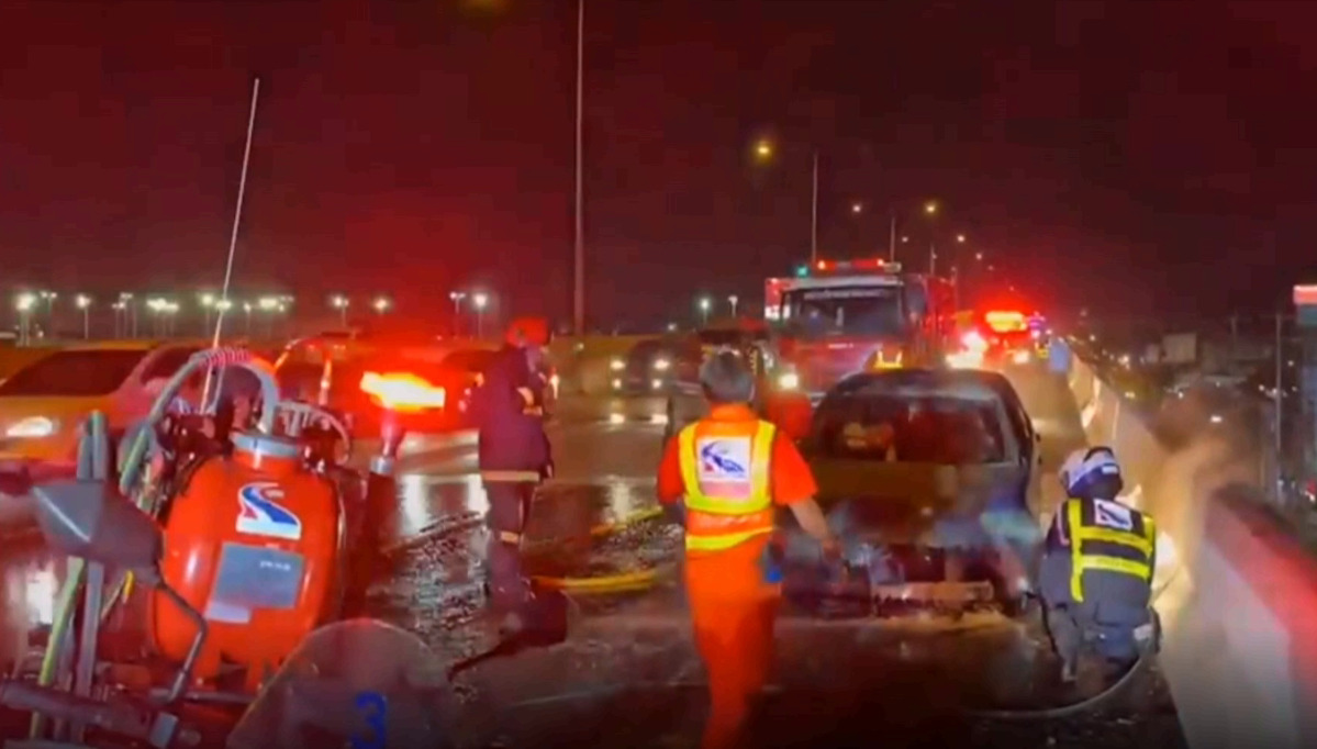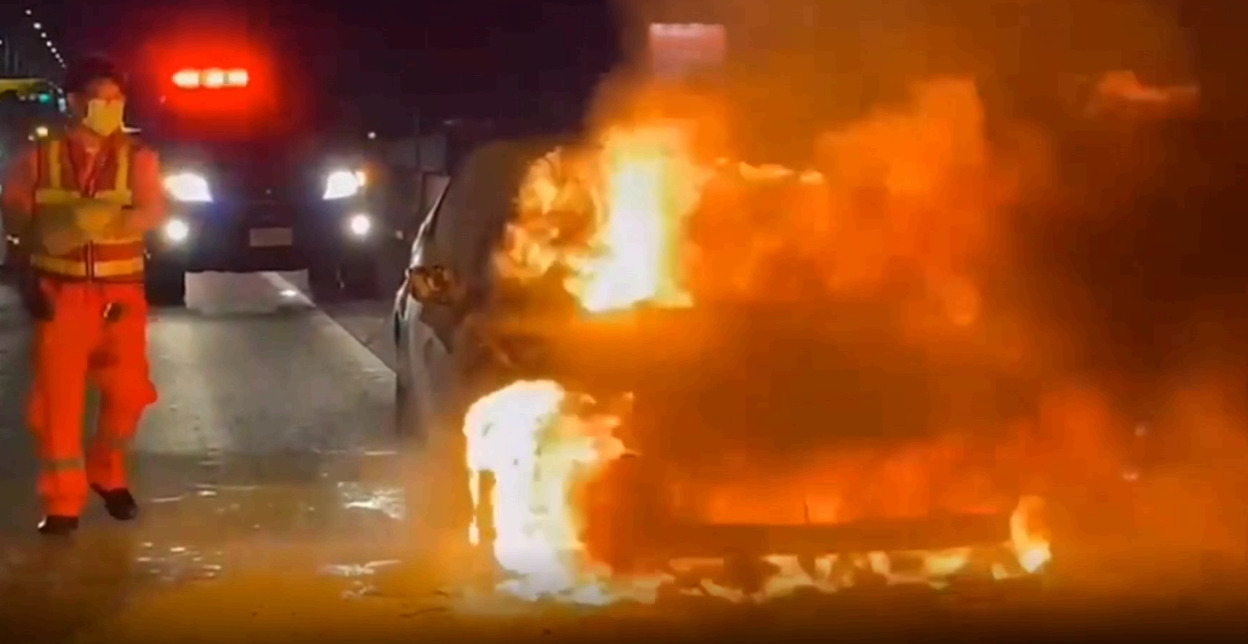 นี่คือสภาพของรถ BMW สีดำ ไฟกำลังโหมไหม้อย่างหนัก บนทางด่วนบูรพาวิถี ขาเข้า หลักกิโลเมตรที่ 21 ตำบลศีรษะจรเข้ใหญ่ อำเภอบางเสาธง จังหวัดสมุทรปราการ ที่ซึ่งจอดในเลนซ้ายสุด ระหว่างที่รอรถดับเพลิงเข้าระงับเหตุ เพลิงได้โหมลุกไหม้จากห้องเครื่องด้านหน้ารถและลุกลามเข้าห้องโดยสารอย่างรวดเร็ว เจ้าหน้าที่กู้ภัยทางด่วนพยามใช้ถังเคมีและน้ำที่พอหาได้เข้าระงับเหตุเพื่อลดความรุนแรง แต่ก็ไม่เป็นผล จนกระทั่งลุกไหม้ราว 10 นาที รถดับเพลิงจาก อบต.บางเสาธง จึงเดินทางมาถึงและรีบใช้น้ำฉีดสกัดเพลิงใช้เวลาประมาณ 30 นาทีเพลิงจึงสงบ จากการตรวจสอบสภาพรถคันดังกล่าวเหลือเพียงช่วงท้ายของรถที่ไม่ถูกเพลิงไหม้เท่านั้น
