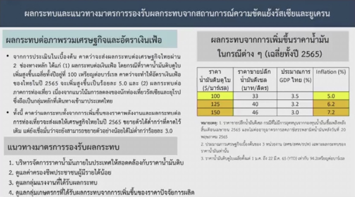 นายดนุชา พิชยนันท์ เลขาธิการสำนักงานสภาพัฒนาการเศรษฐกิจและสังคมแห่งชาติ (สศช.) เปิดเผยว่า จากปัญหาราคาน้ำมันที่ขยับสูงขึ้น และปัญหาความขัดแย้งระหว่างรัสเซีย-ยูเครน ที่เกิดขึ้น หน่วยงานทางด้านเศรษฐกิจทั้ง 3 หน่วย ประกอบด้วย สภาพัฒน์ฯ สำนักงานเศรษฐกิจการคลัง และธนาคารแห่งประเทศไทย ได้หารือร่วมกันและประเมินสถานการณ์ เพื่อหาแนวทาง มาตรการรองรับผลกระทบ ซึ่งจากการประเมินเบื้องต้น คาดว่าจะส่งผลกระทบต่อเศรษฐกิจไทยใน 2 ด้าน คือ อัตราเงินเฟ้อ โดยกรณีที่ราคาน้ำมันดิบดูไบเพิ่มสูงขึ้นเฉลี่ยอยู่ที่ 100 ดอลลาร์สหรัฐ/บาร์เรล คาดว่าจะทำให้เงินเฟ้อปี 2565 ของไทยขยับขึ้นเป็น 5% และอีกด้านที่จะได้รับผลกระทบ คือ ภาคการท่องเที่ยว เนื่องจากแนวโน้มการลดลงของนักท่องเที่ยวรัสเซียและยุโรป ซึ่งถือเป็นกลุ่มหลักที่เดินทางเข้ามาประเทศไทย