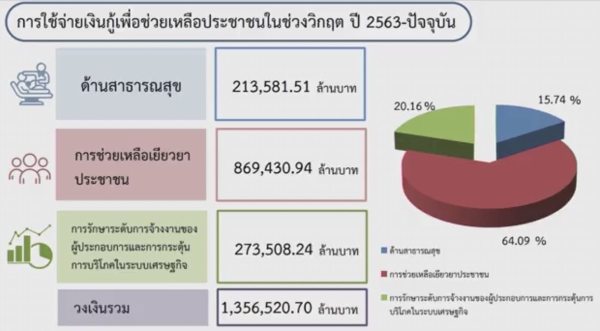 นอกจากนี้ นายดนุชา ยังเผยตัวเลขการจ่ายเงินกู้เพื่อช่วยเหลือประชาชนในช่วงโควิด-19 ตั้งแต่ปี 2563-ปัจจุบัน รวมเป็นวงเงิน 1,356,520.70 ล้านบาท โดยแบ่งเป็นด้านสาธารณสุข 213,581.51 ล้านบาท การช่วยเหลือเยียวยาประชาชน 869,430.94 ล้านบาท และการรักษาระดับการจ้างงานของผู้ประกอบการและการกระตุ้นการบริโภคในระบบเศรษฐกิจ 273,508.24 ล้านบาท. – สำนักข่าวไทย