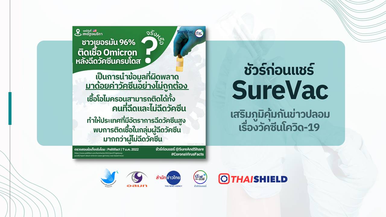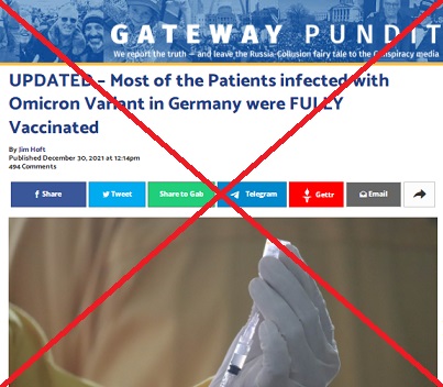 มีข้อมูลเท็จเผยแพร่ทางเว็บไซต์ในสหรัฐอเมริกา โดย Gateway Pundit เว็บไซต์ที่นำเสนอเนื้อหาเชิงอนุรักษ์นิยม อ้างว่ามีชาวเยอรมันที่ฉีดวัคซีนครบโดสถึง 96% ติดเชื้อโควิด 19 สายพันธุ์โอไมครอน ส่วนผู้ที่ไม่ฉีดวัคซีนติดเชื้อโอไมครอนแค่ 4% เท่านั้น