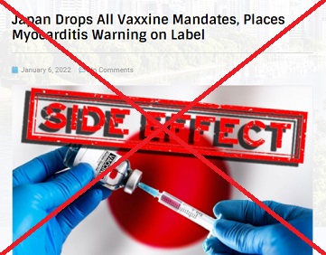 มีข้อมูลบิดเบือนเผยแพร่ทาง Facebook ในสหรัฐอเมริกา เมื่อ Brisbane National Review เว็บไซต์จากประเทศออสเตรเลียรายงานว่า ประเทศญี่ปุ่นล้มเลิกนโยบายบังคับให้ประชาชนฉีดวัคซีนโควิด 19 หลังมีการประกาศเตือนบนฉลากขวดวัคซีนเรื่องอาการข้างเคียงเกี่ยวกับกล้ามเนื้อหัวใจอักเสบ