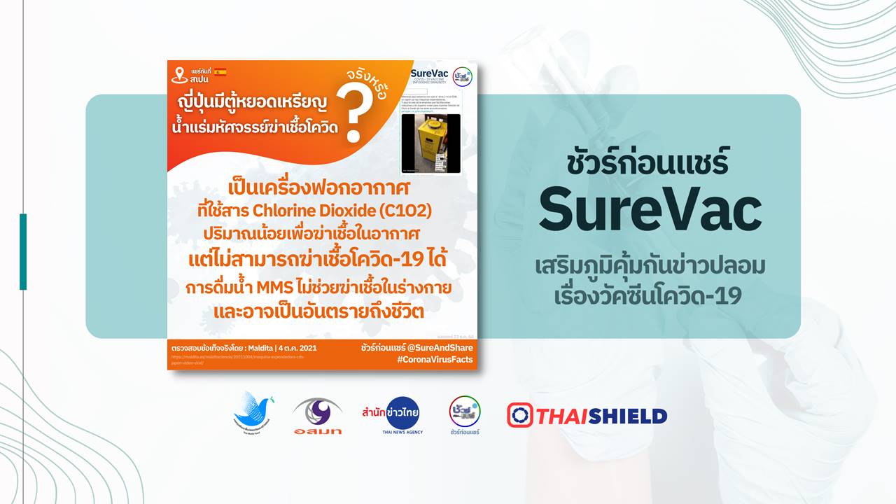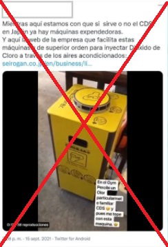 จากการตรวจสอบโดย Maldita พบว่าภาพที่แชร์ทางออนไลน์ว่าเป็นตู้หยอดเหรียญจำหน่ายน้ำ MMS แท้จริงแล้วคือเครื่องฟอกอากาศที่ใช้สาร Chlorine Dioxide (C1O2) ในปริมาณต่ำเพื่อทำให้อากาศบริสุทธิ์ ซึ่งบริษัทผู้ผลิตย้ำว่าเครื่องฟอกอากาศที่ใช้สาร C1O2 ไม่ใช่อุปกรณ์ทางการแพทย์ ไม่สามารถฆ่าเชื้อไวรัสหรือแบคทีเรียได้ทุกชนิด และไม่ได้ระบุว่าสามารถฆ่าเชื้อไวรัสโควิด 19 ตามที่กล่าวอ้างอีกด้วย