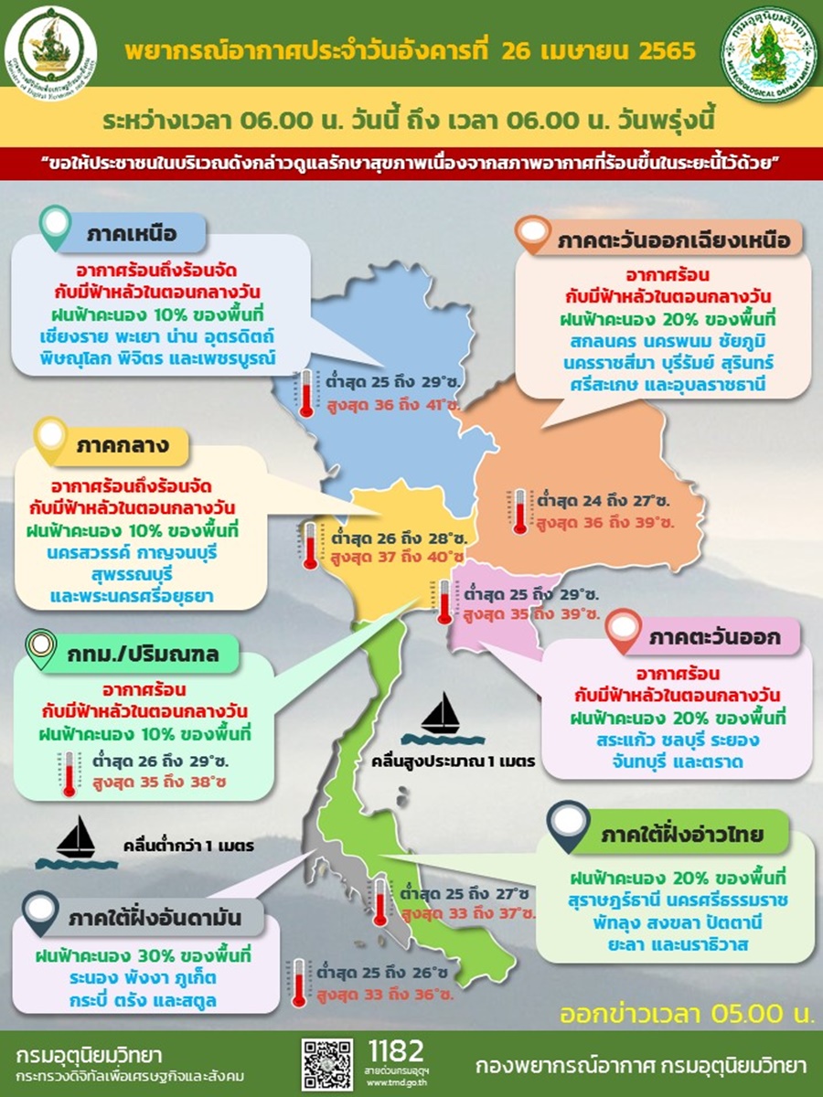กรมอุตุฯ 26 เม.ย. – กรมอุตุฯ เผยไทยตอนบน รวมทั้งกรุงเทพฯ-ปริมณฑล อากาศร้อน โดยมีอากาศร้อนจัดบางพื้นที่ในภาคเหนือ-ภาคกลาง ขณะที่ภาคใต้มีฝนฟ้าคะนองบางแห่ง