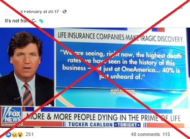 มีข้อมูลเท็จเผยแพร่ทางสื่อโทรทัศน์ในสหรัฐอเมริกา โดย ชาร์ลี เคิร์ก ประธานกลุ่ม Turning Point USA องค์กรเผยแพร่แนวคิดอนุรักษ์แก่สถานศึกษาในสหรัฐฯ และมีประวัติเผยแพร่ข่าวปลอมเกี่ยวกับวัคซีนโควิด 19 ให้สัมภาษณ์กับสำนักข่าว Fox News เมื่อวันที่ 7 กุมภาพันธ์ปี 2022 ว่า อัตราการเสียชีวิตของชาวอเมริกันเพิ่มขึ้นอย่างมากในปี 2021 ซึ่งเป็นปีที่มีการรณรงค์ฉีดวัคซีนโควิด 19 อย่างแพร่หลาย ดังนั้นวัคซีนโควิด 19 จึงเป็นปัจจัยทำให้ชาวอเมริกันเสียชีวิตเพิ่มขึ้น นอกจากนี้ยังมีการแชร์ข้อความทางเว็บไซต์ว่า ธุรกิจประกันชีวิตตกต่ำลง แต่ธุรกิจจัดงานศพเฟื่องฟูในปี 2021 เพราะการฉีดวัคซีนโควิด 19
