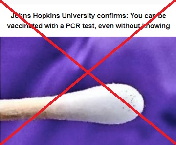 มีข้อมูลบิดเบือนเผยแพร่ทาง Facebook ในสหรัฐอเมริกาโดยอ้างว่า งานวิจัยจากมหาวิทยาลัย Johns Hopkins University ยืนยันว่า มีวิธีฉีดวัคซีนผ่านการแยงจมูกด้วยวิธี Swab โดยผู้เข้ารับการตรวจจะถูกฉีดวัคซีนโดยไม่รู้ตัว พร้อมย้ำว่าการรณรงค์ใช้ชุดตรวจ PCR test อย่างแพร่หลาย เป็นแผนขององค์การอนามัยโลก (WHO) ที่ต้องการเพิ่มอัตราการฉีดวัคซีนโควิด 19